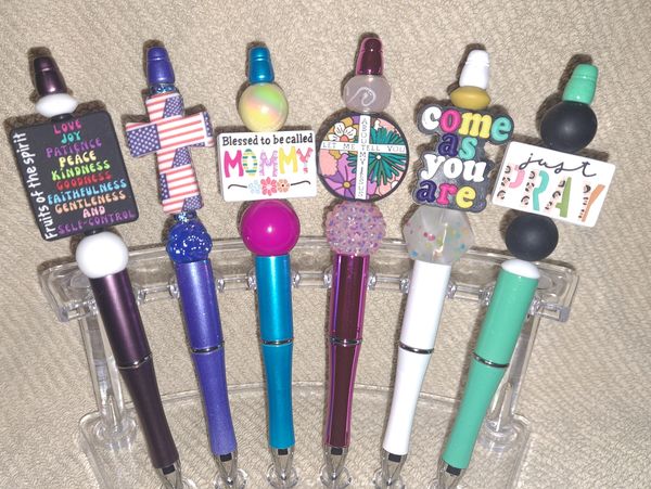 Colorful pens with silicone focal beads featuring Christian images, themes, song lyrics, encouragement etc.